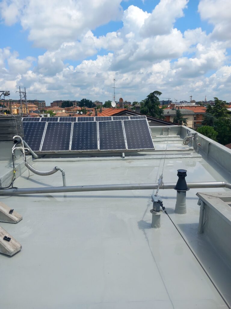 • L’installazione dei pannelli FV viene eseguita nel modo e metodo conosciuto a zavorra su coperture piane e a staffeggi meccanici direttamente ancorati alle lastre in cemento sui piani inclinati;